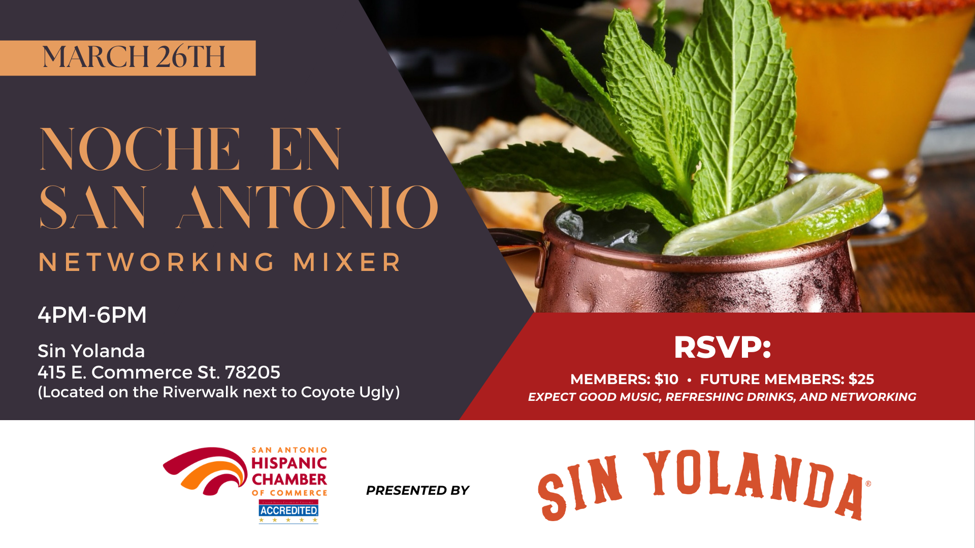 Join the San Antonio Hispanic Chamber of Commerce for a vibrant Noche en San Antonio Mixer hosted by Sin Yolanda — where buena bebida and buena música set the tone for an unforgettable evening of networking and celebration.