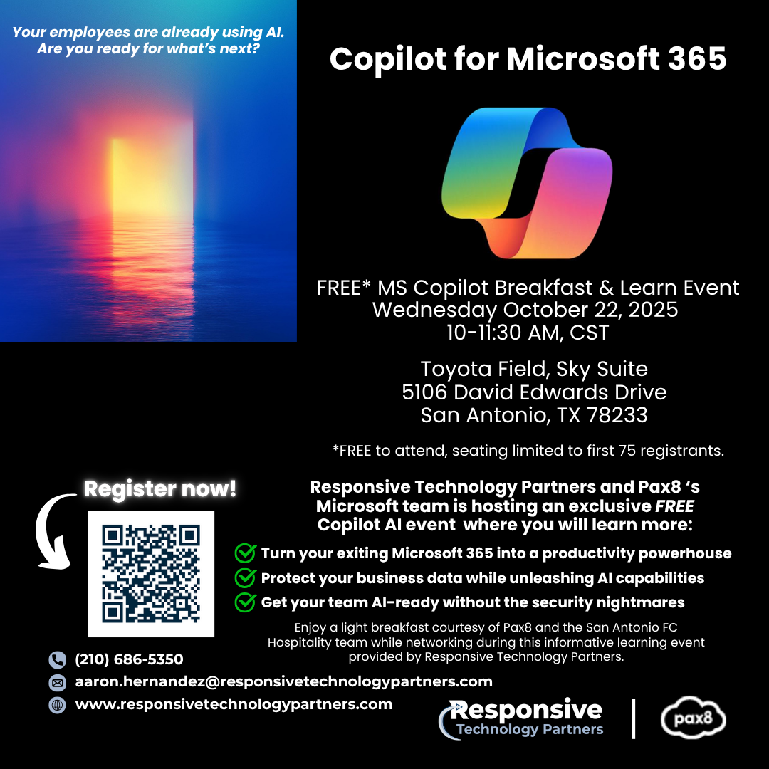 Discover how to supercharge productivity with AI! Join Responsive Technology Partners and Pax8 for a FREE Microsoft Copilot event.