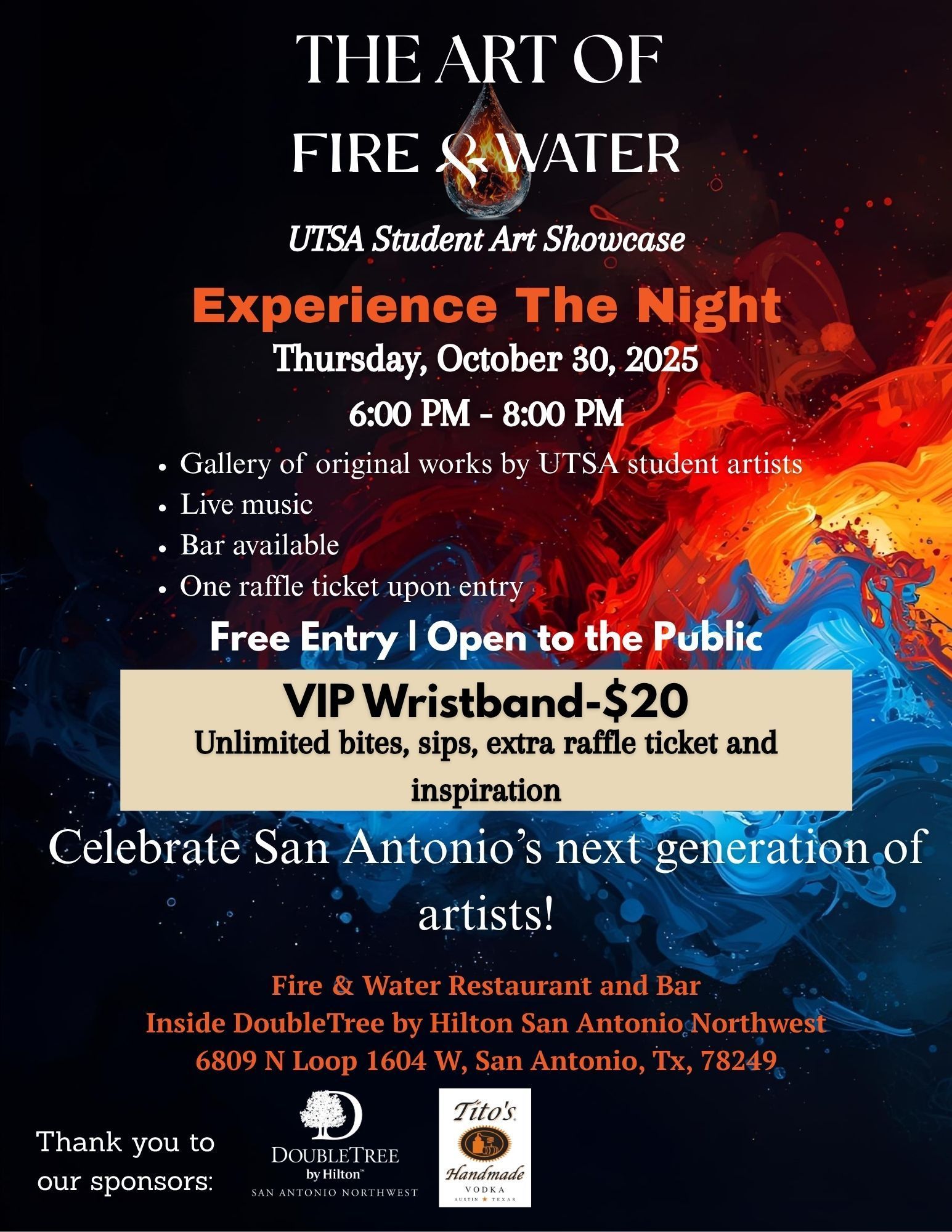 Join us for an inspiring evening celebrating the creativity of UTSA student artists at The Art of Fire & Water Student Art Showcase! Enjoy a gallery of original student works, live music, and great company. Admission is free and open to the public! Upgrade your night with a $20 VIP wristband for unlimited bites, sips, and extra raffle chances.