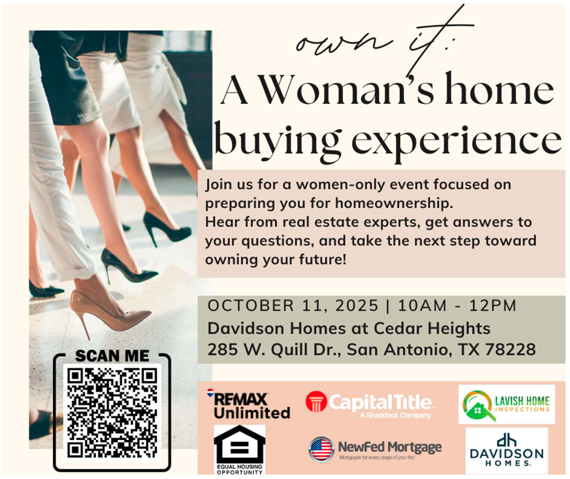 Own it: A Woman's home buying experience event focused on preparing you for homeownership. Hear from Real Estate Experts, get answers to your questions, and take the next step toward owning your future. Saturday, October 11, 2025 from 10 am-12 p.m. Davidson Homes at Cedar Heights located at 285 W Quill Drive, San Antonio, TX 78228