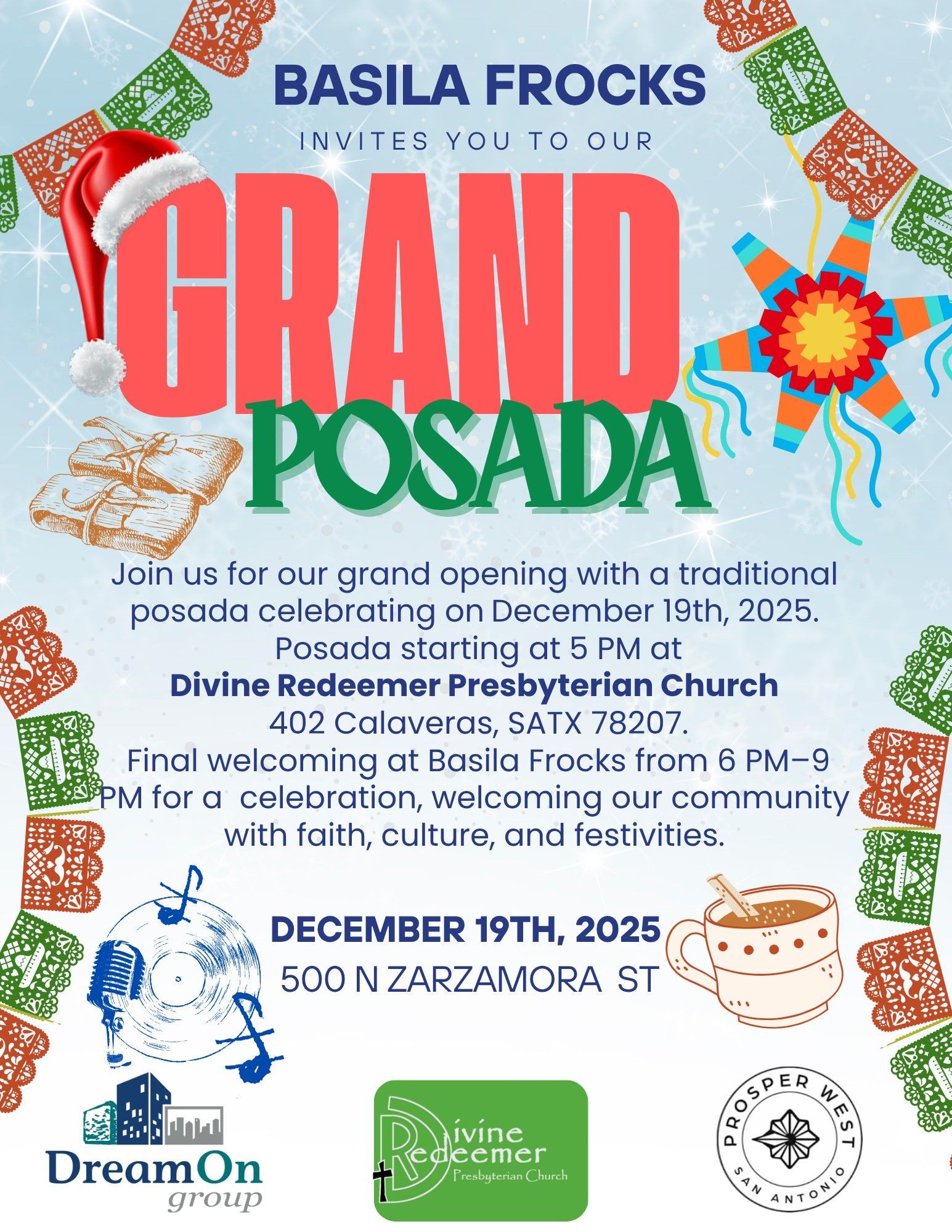 Join us for our grand opening with a traditional posada celebrating on December 19th-Posada starting at 5pm at Devine Redeemer Presbyterian Church 402 Calaveras-Final welcoming at Basila Frocks from 6p-9p with a celebration, welcoming our community with faith, culture, and festivities.