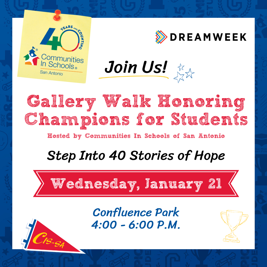 We are thrilled to invite you to a special celebration of 40 years of impact with Communities In Schools of San Antonio! Step Into 40 Stories of Hope: Join us for an interactive gallery walk honoring champions for students. Explore powerful stories and mantras from 40 distinguished community members whose advocacy has shaped educational outcomes in San Antonio and beyond. Enjoy live entertainment, light refreshments, and meaningful conversations celebrating student success and community support.